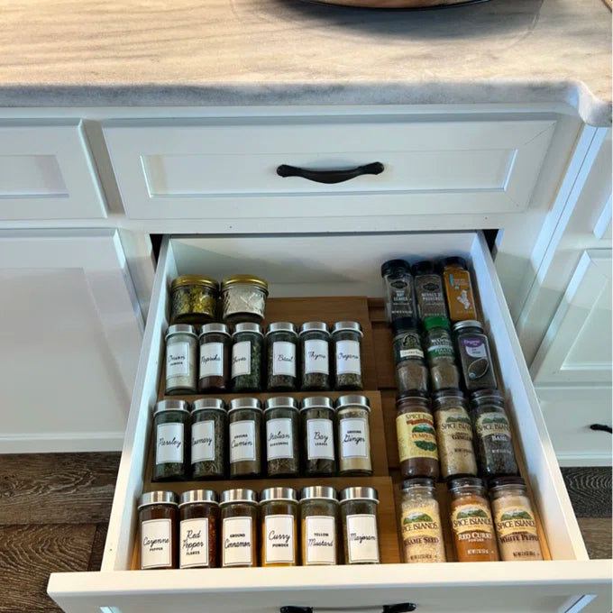 Expandable to fit standard kitchen drawers, crafted from durable natural bamboo, and designed to keep every spice visible, accessible, and perfectly in place.
