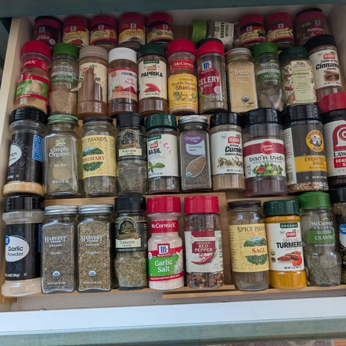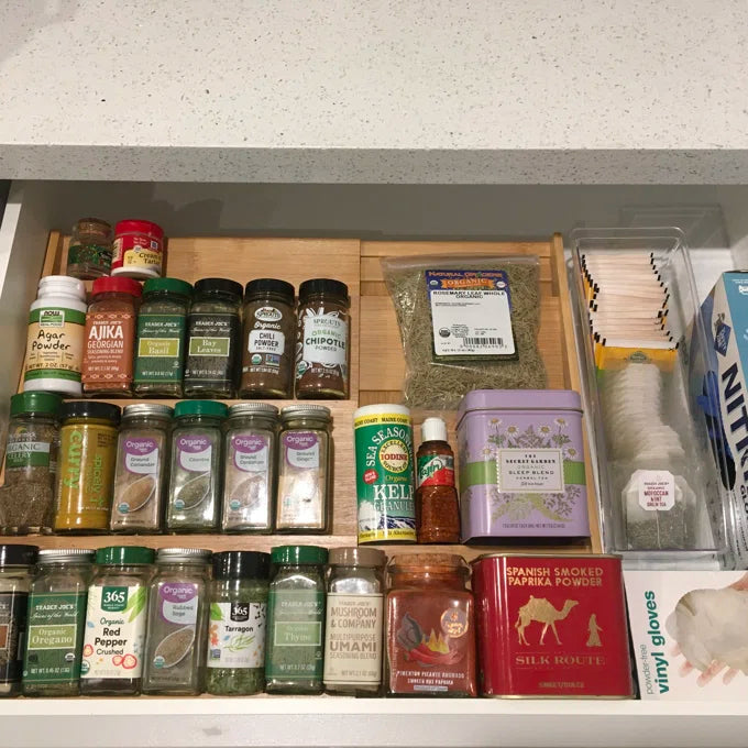 Expandable Bamboo Spice Drawer Organizer — Clean, Calm Kitchen Storage