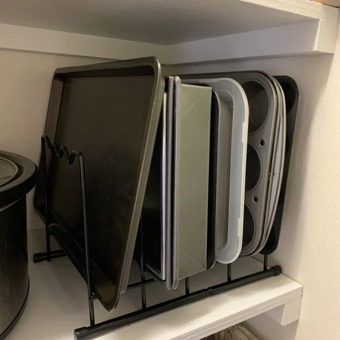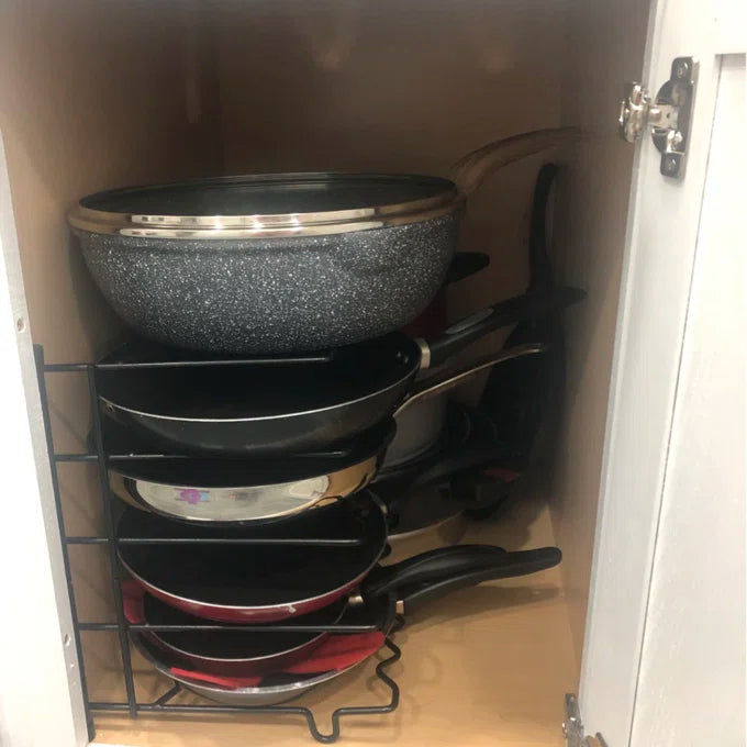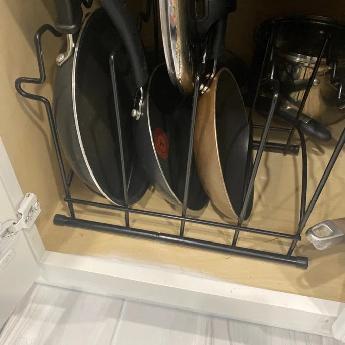 This heavy-duty pan organizer securely stores cast iron skillets, pans, and lids vertically to save space and protect your cookware.